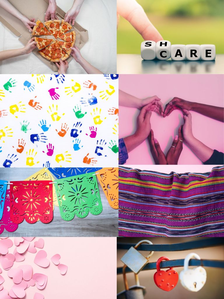 Mood board and ALT Text: slices of pizza, “share/care” blocks, handprints, hands making a heart shape, Hispanic decorations, heart petals, heart-shaped locks