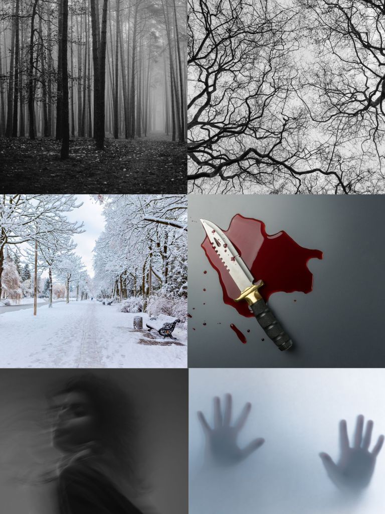 ALT Text for My Mood Board–what’s pictured: woods, tree branches, snowy woods, knife with blood, ghost, hands